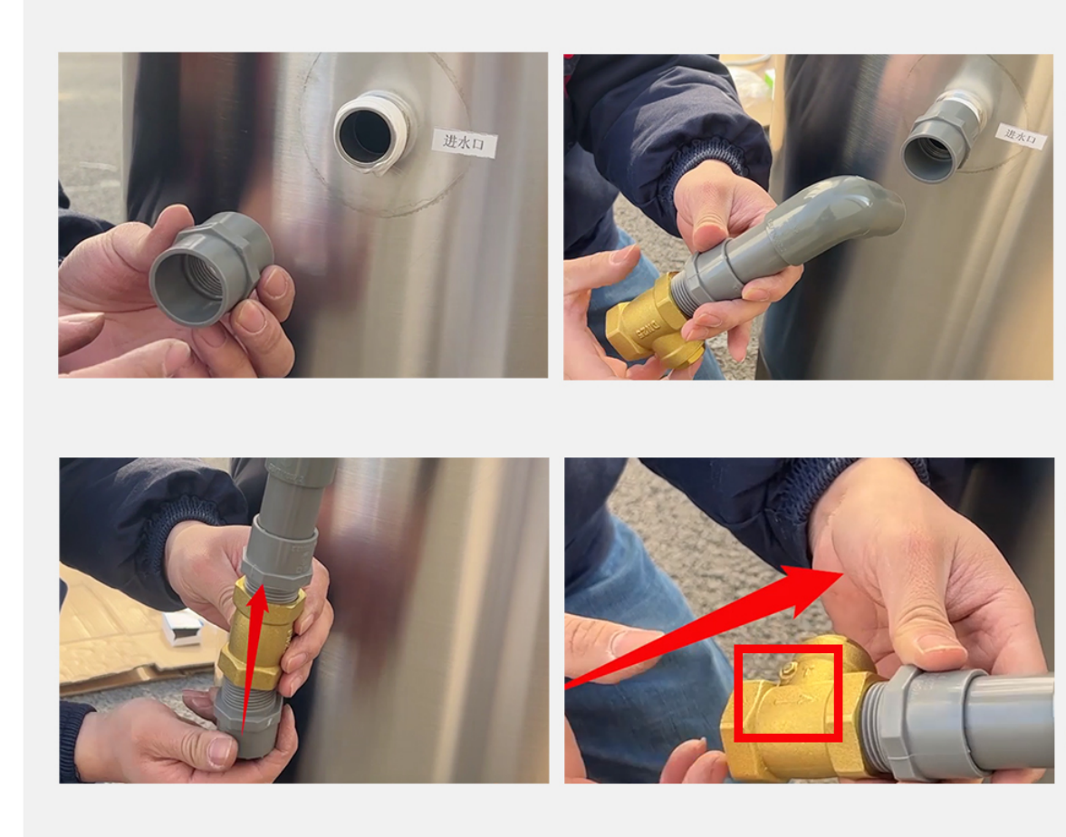 1、進水口接水泵:一定要把生料帶纏平纏均勻,以免漏水)先安裝一個一寸的活接,方便以后檢修活接纏繞好生料帶后和止回閥連接好(注意:盡量不要把止回閥直接裝上去,防止絲口損壞)