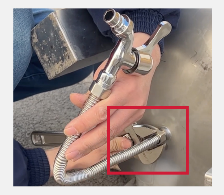 3、安裝排污口:將波紋管兩側(cè)藍色蓋帽取下,將波紋管拉直,大概三指距離彎一個直角(注意內(nèi)部密封圈不要掉了),將波紋管安裝到罐體底部的排污口,另一端也要安裝好密封圈,最后將排污水龍頭安裝好。