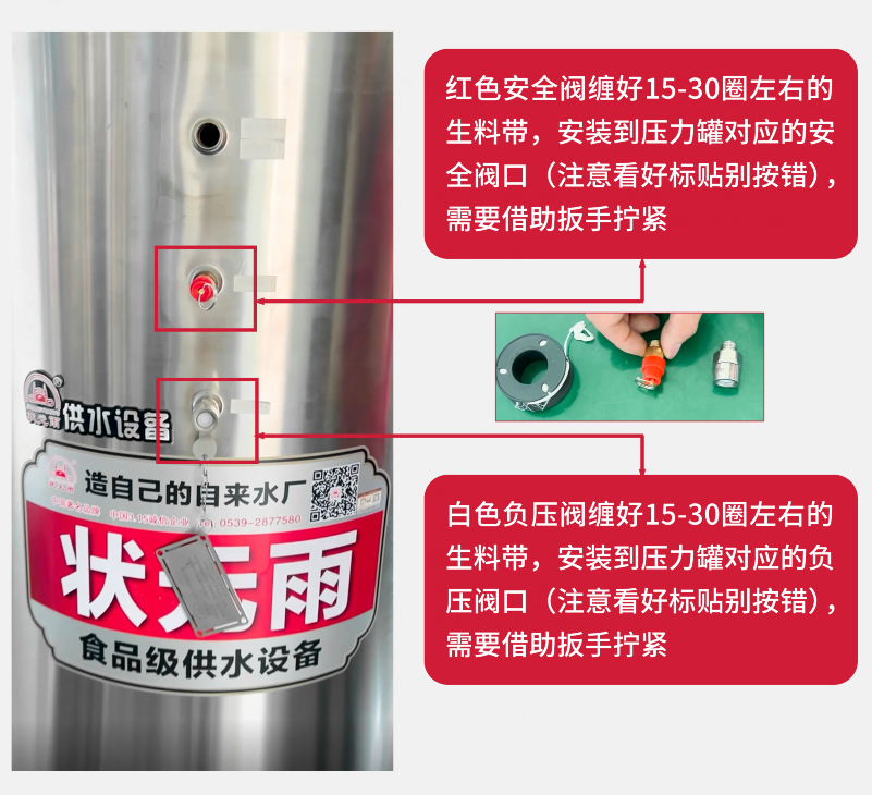 1、紅色安全閥纏好15-30圈左右的生料帶,安裝到壓力罐對應(yīng)的安全閥口(注意看好標(biāo)貼別按錯),需要借助扳手?jǐn)Q緊