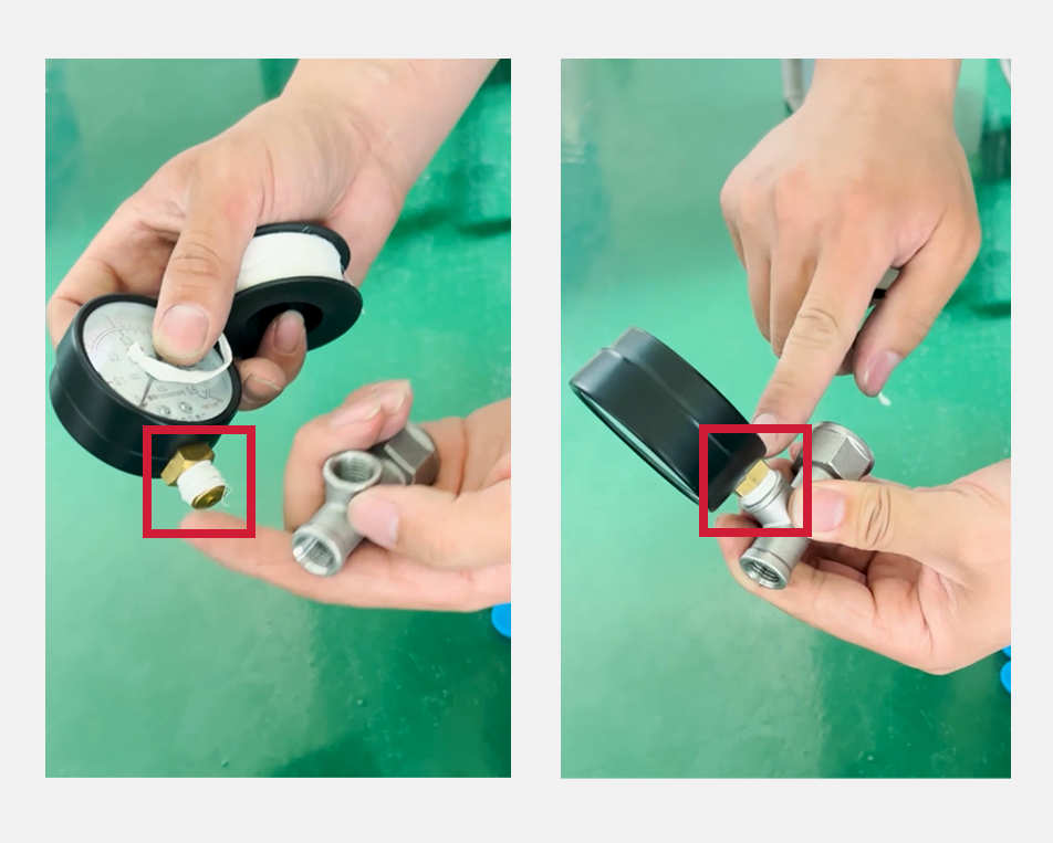 1、將壓力表纏好生料帶,擰到三通上