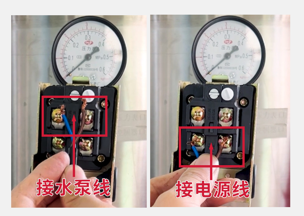 頂部兩個端子接水泵線,底部兩個端子接電源線,接線完成后,裝好保護蓋。