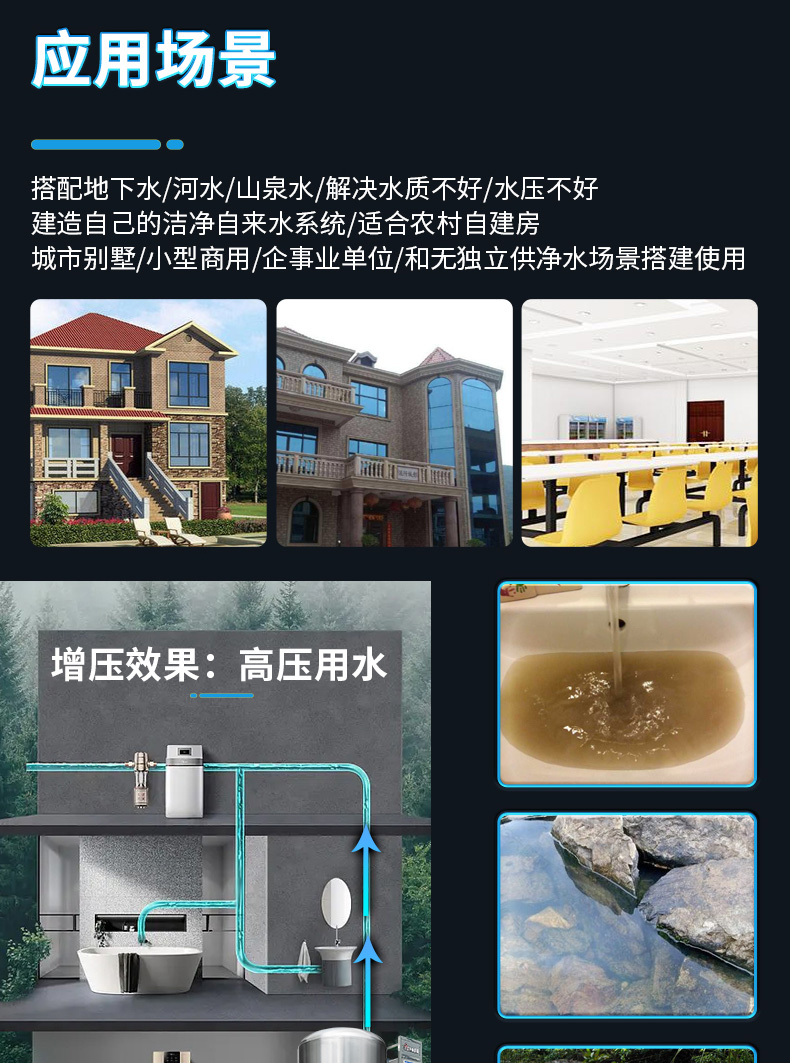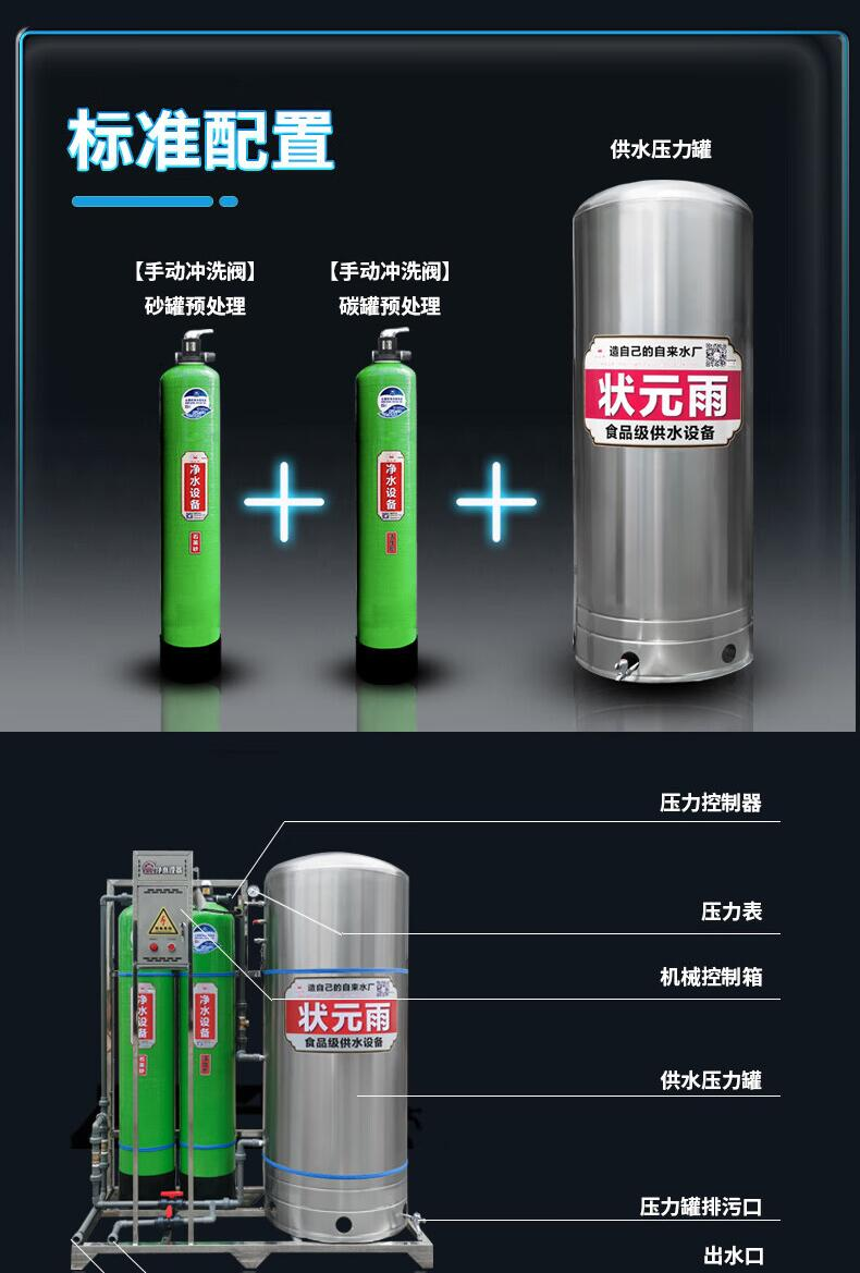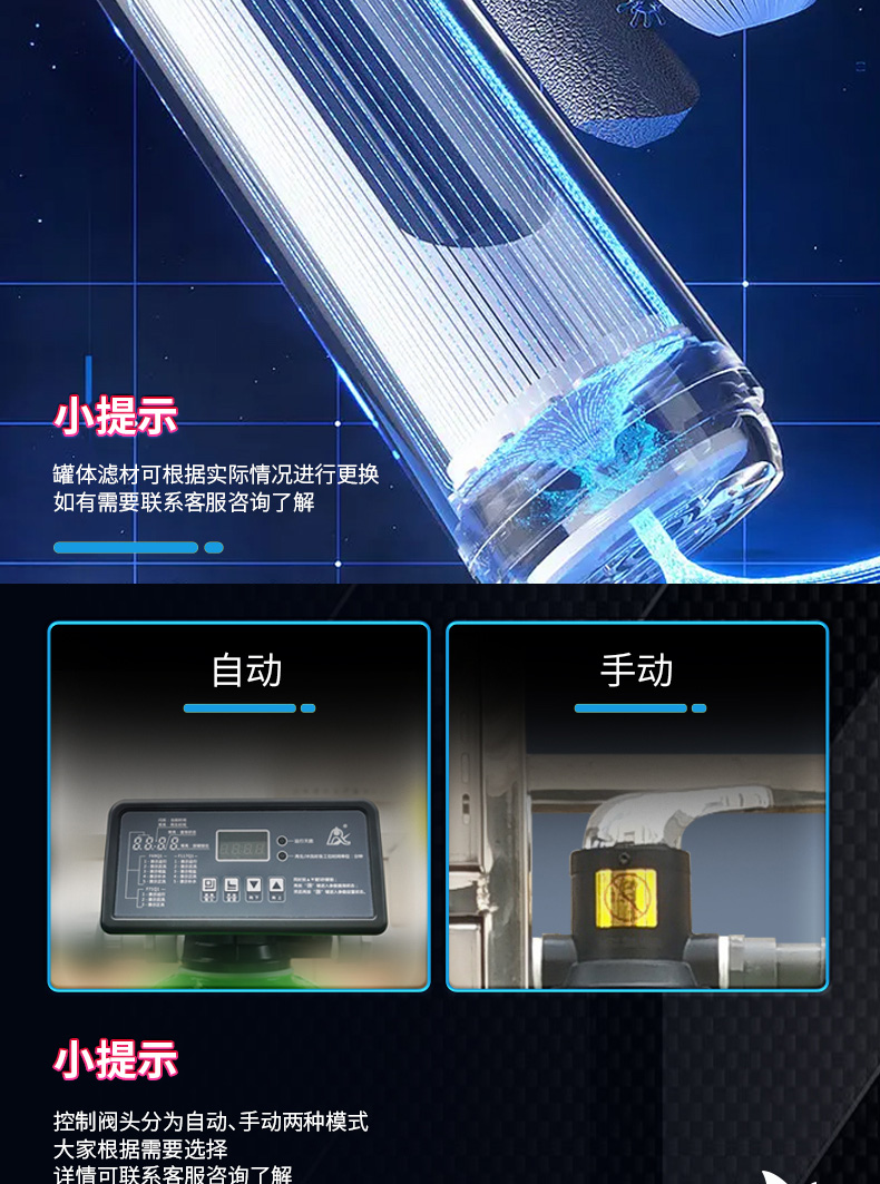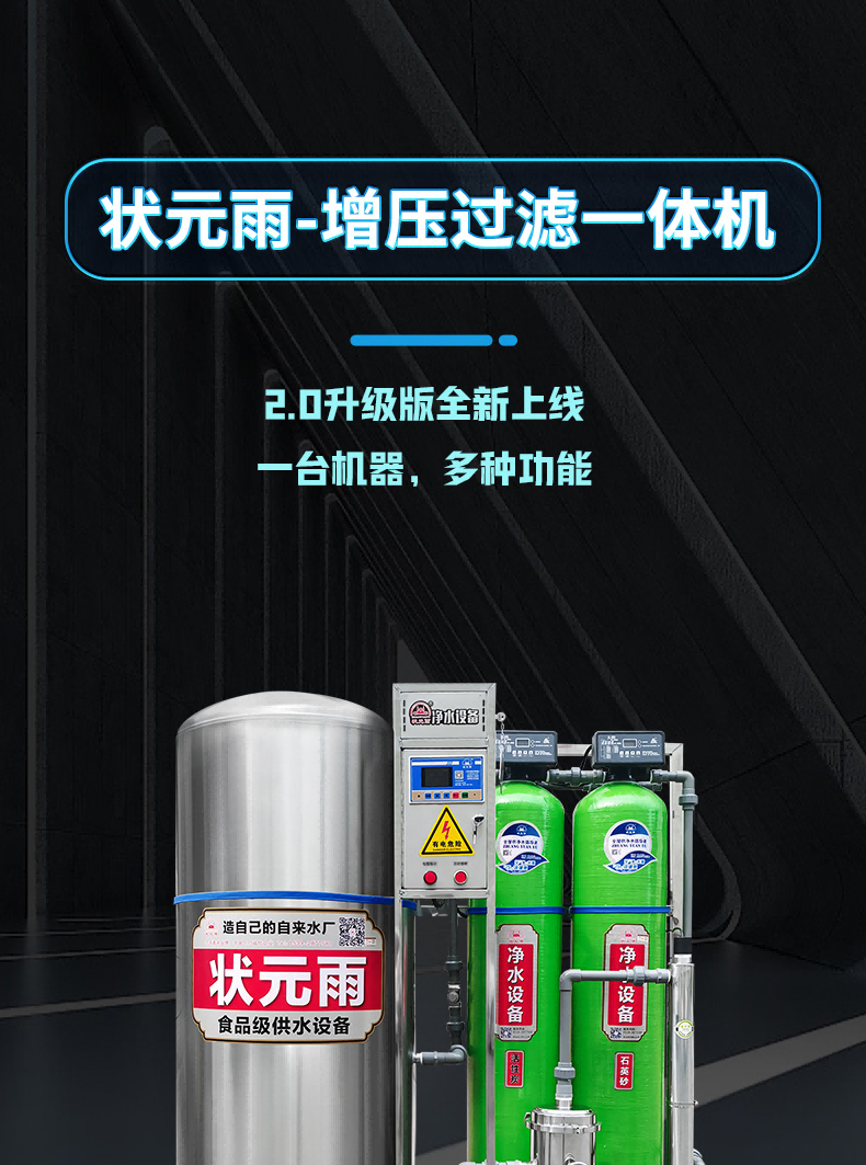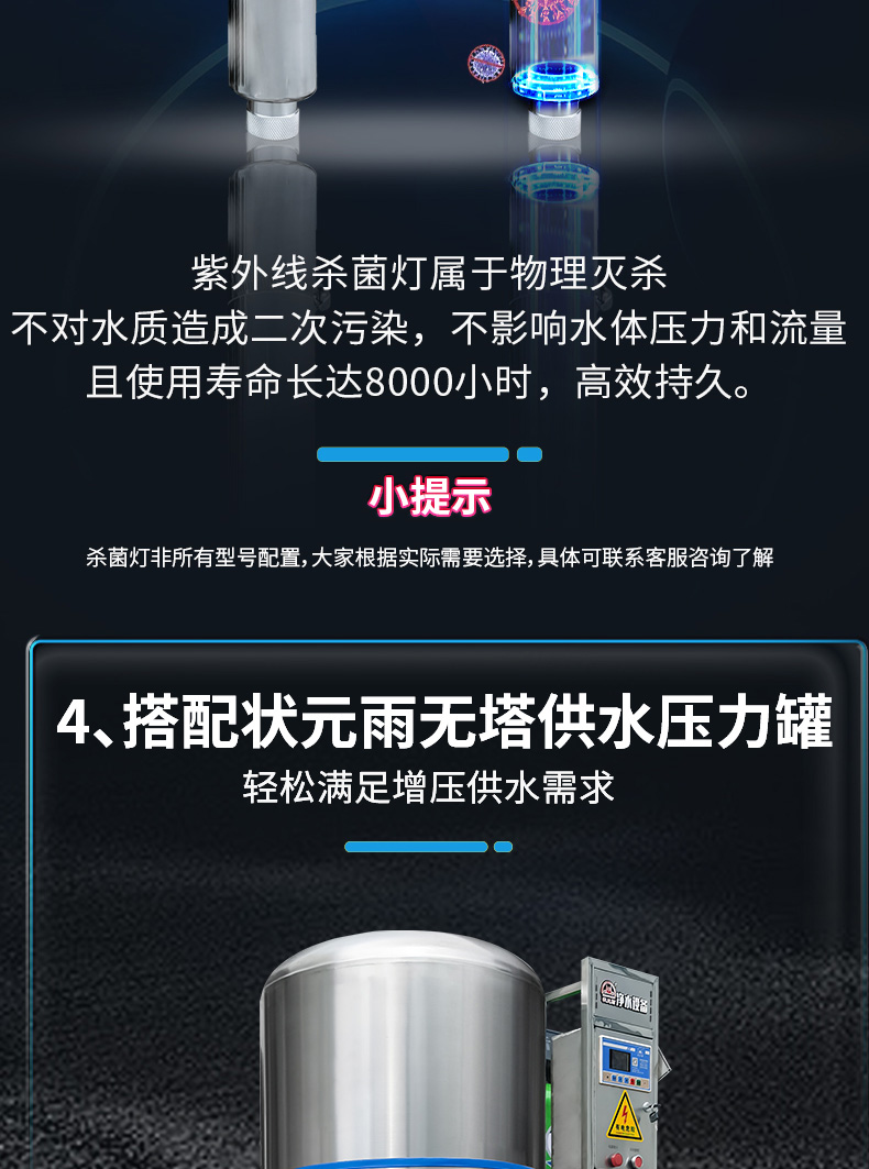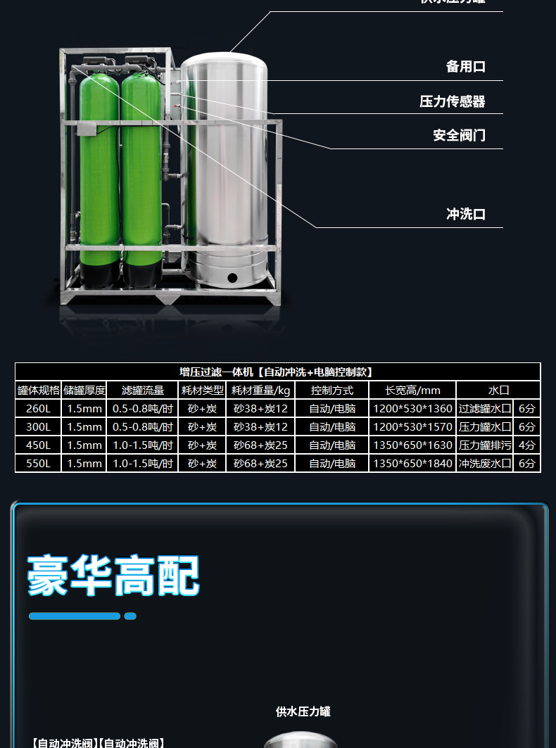 設備規(guī)格: 260升手動沖洗機械款砂碳初濾增壓過濾一體機 260升自動沖洗智能款砂碳初濾增壓過濾一體機 260升自動沖洗智能款砂碳初濾+超濾過濾器+紫外線殺菌增壓過濾一體機 300升………… 450升………… 550升…………